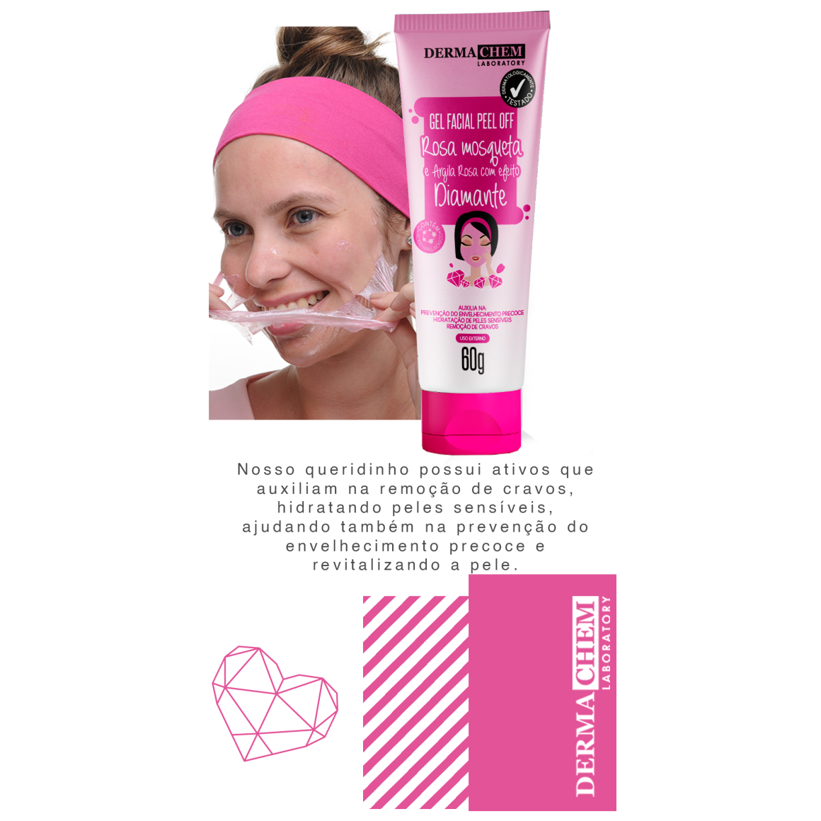O Gel Facial Peel Off Rosa Mosqueta e Argila Rosa com Efeito Diamante, possui ativos que associados ao ácido hialurônico, argila rosa e óleo rosa mosqueta auxiliam na remoção de cravos hidratando peles sensíveis, auxilia na prevenção do envelhecimento precoce revitalizando a pele.