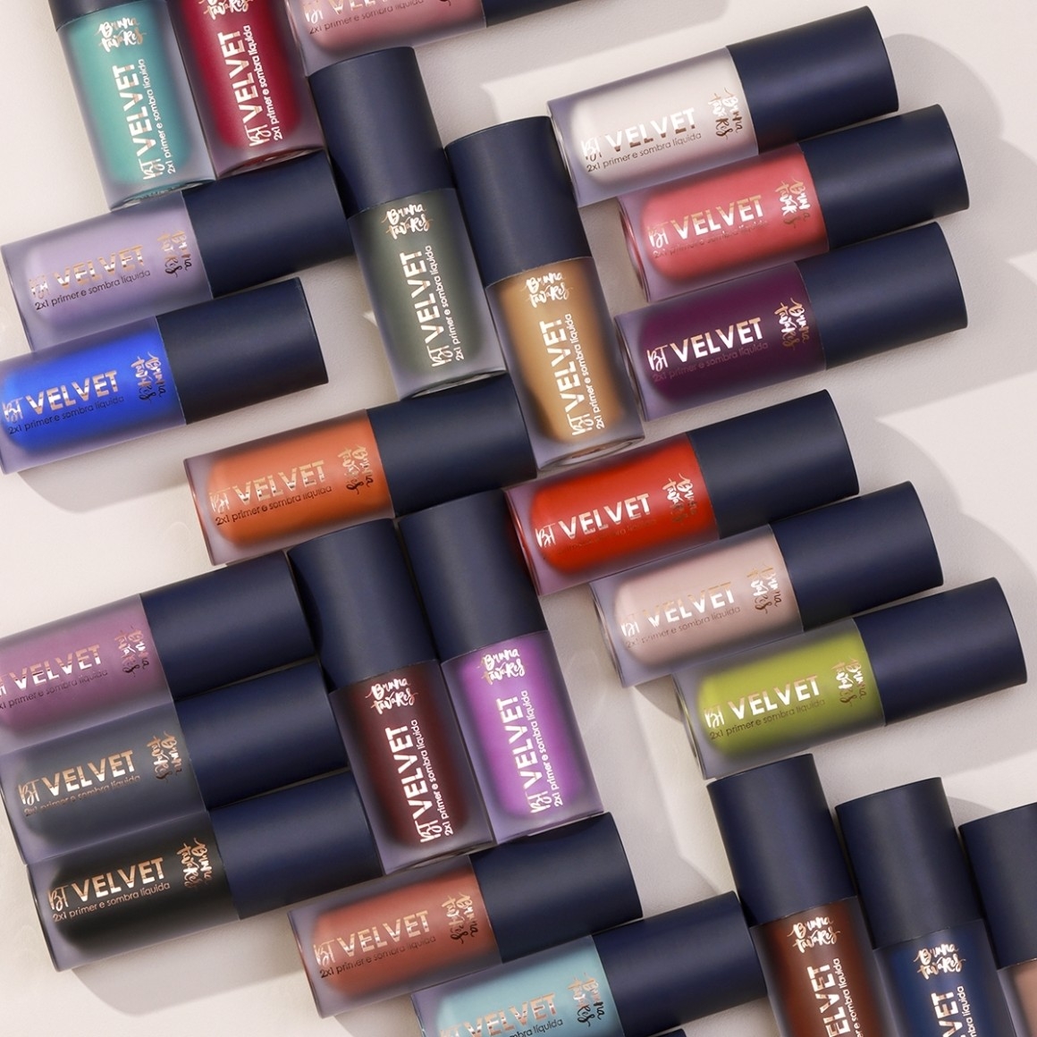 Bruna Tavares possui em sua linha o BT Velvet, que é 2 em 1: primer e sombra líquida aveludada. São cores incrivelmente pigmentadas que você pode usar como quiser. Possui textura cremosa e confortável, longa duração, é resistente à água e tem tamanho compacto, para levar juntinho de você todos os dias.