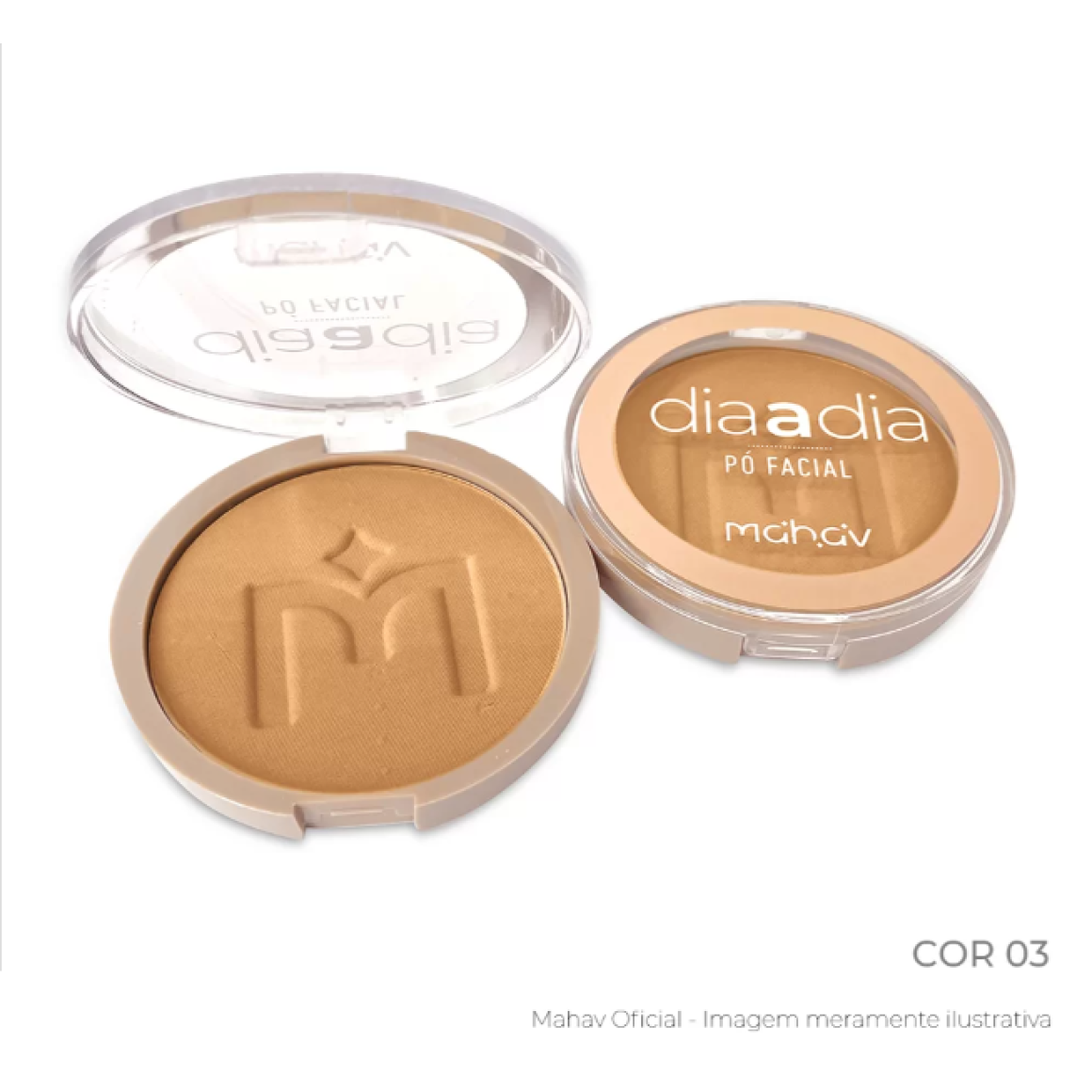 A Mahav é a Rainha dos Pós! Formulados com ótimas matérias-primas que não deixam o aspecto de pele envelhecida. O PÓ FACIAL COMPACTO DIA A DIA MAHAV foi desenvolvido com um sistema de alta micronização, que promove um pó fino, com textura delicada, que uniformiza, matifica e sela a maquiagem com uma cobertura natural, além do toque seco e aveludado. É o produto perfeito para socorrer a pele, no tom certo e sem brilho.