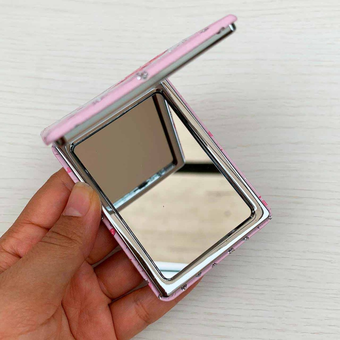 A embalagem, além de linda e compacta, possui dois espelhos, um comum e outro com lente de aumento.