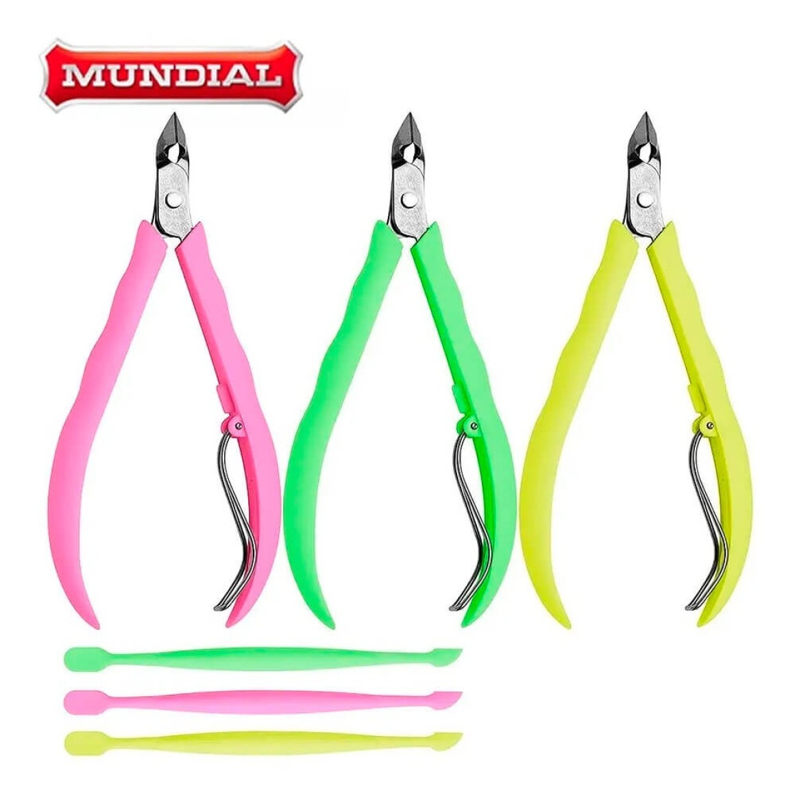 Alicate para Cutícula Mundial Sandy fabricado com aço inox e cabo plastico com proteção contra bactérias para uso individual. Acompanha Espátula Plastica dupla para rasar e empurrar a cutícula.