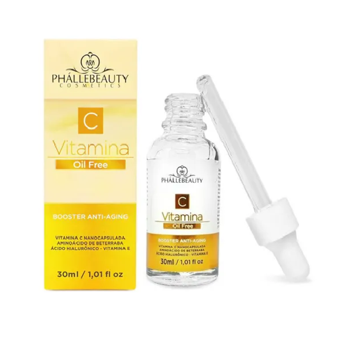 A Vitamina C é um poderoso antioxidante para o tratamento e prevenção dos sinais da idade. O Sérum Vitamina C da Phallebeauty traz em sua formulação propriedades que reduzem as linhas de expressões. Possui toque seco e rápida absorção, hidrata a pele fechando os poros. Contém vitamina C nanocapsulada, aminoácido de beterraba, ácido hialurônico e vitamina E. Seus Principais Benefícios são: Combate ação dos radicais livres, prevenindo os sinais prematuros da idade na pele e reduzindo as linhas finas de flacidez.