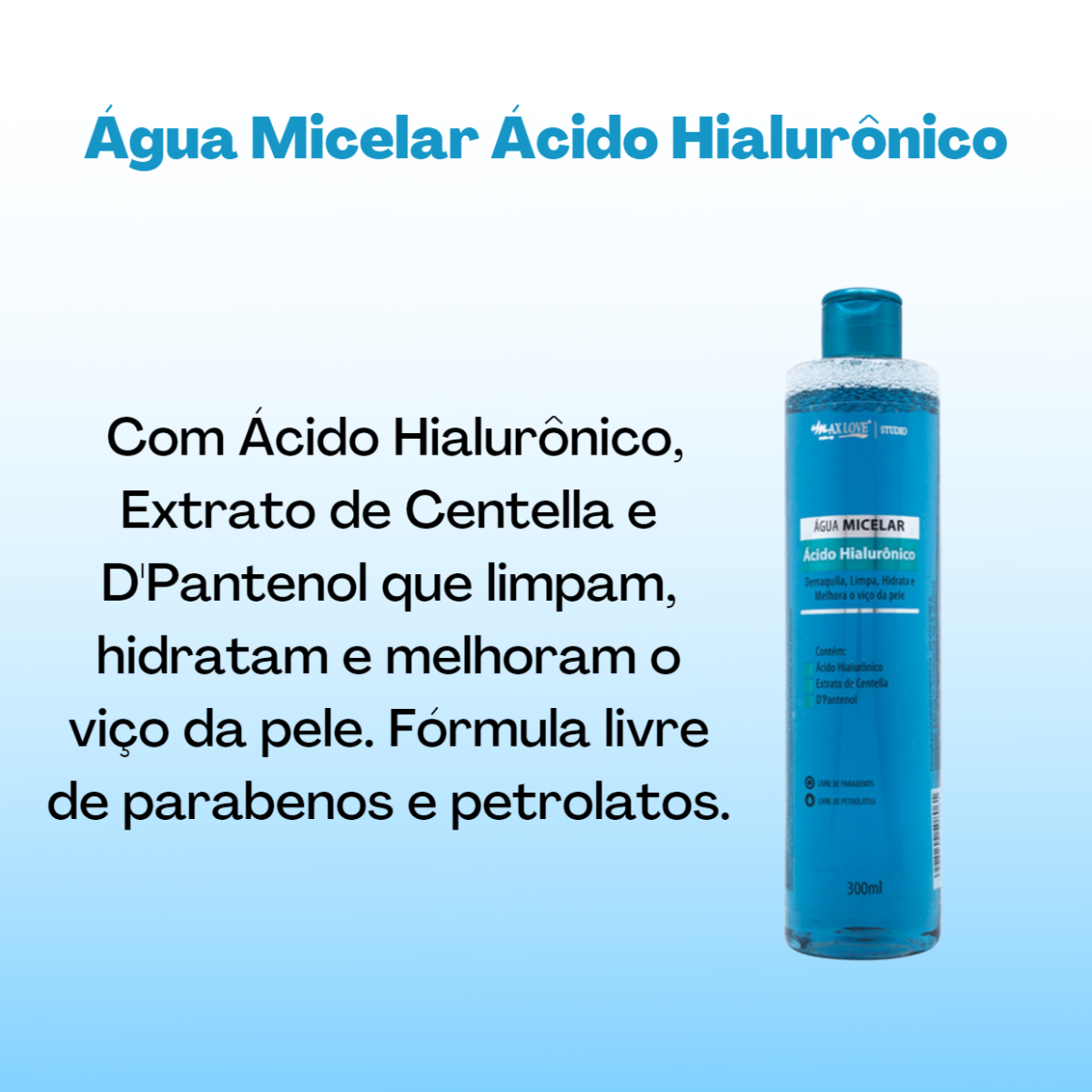 A Água Micelar Ácido Hialurônico Max Love foi desenvolvida para promover uma limpeza facial suave, removendo toda maquiagem e impurezas sem agredir a pele. Enriquecida com Ácido Hialurônico, Extrato de Centella e D'Pantenol que limpam, hidratam e melhoram o viço da pele.