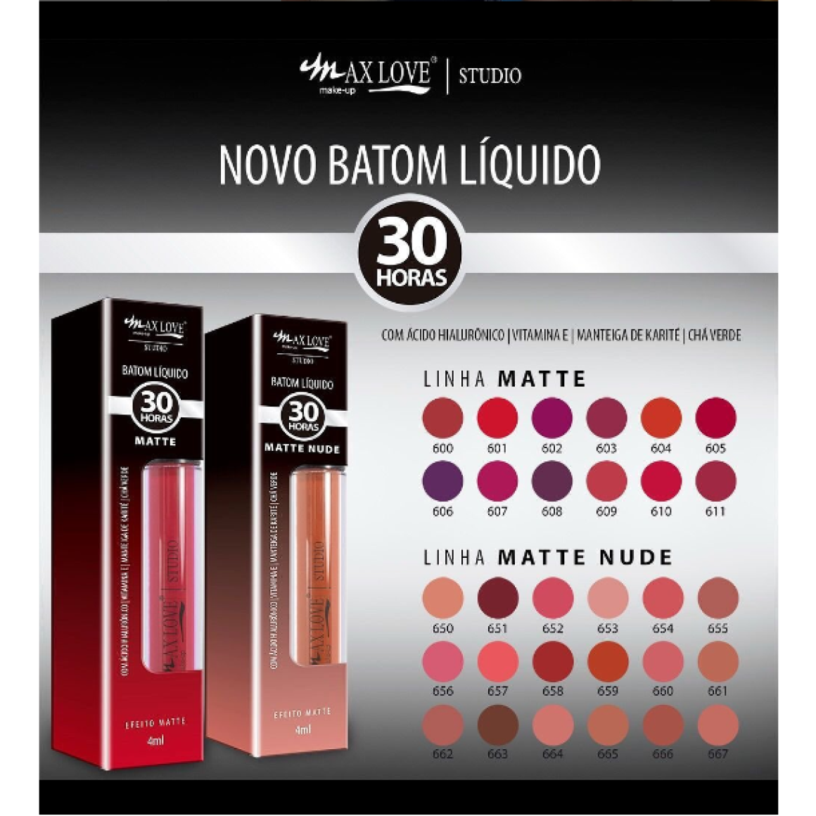 O Batom Líquido 30 Horas Max Love além de proporcionar duração de até 30 horas, também cuida dos lábios, pois sua fórmula é enriquecida com Ácido Hialurônico, Vitamina E, Manteiga de Karité e Chá Verde. Acabamento matte e tons nude.
