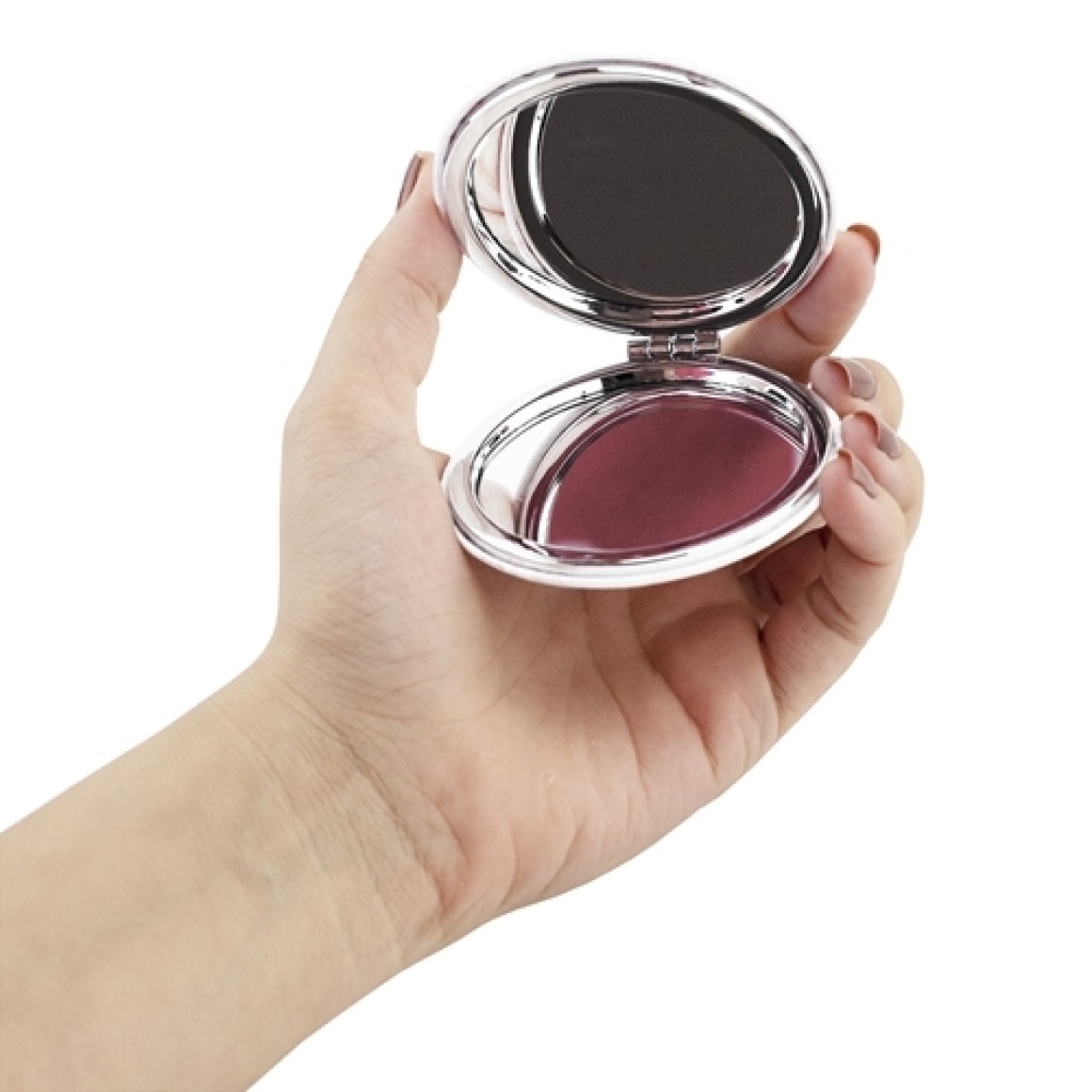 A embalagem, além de linda e compacta, possui dois espelhos, um comum e outro com lente de aumento.