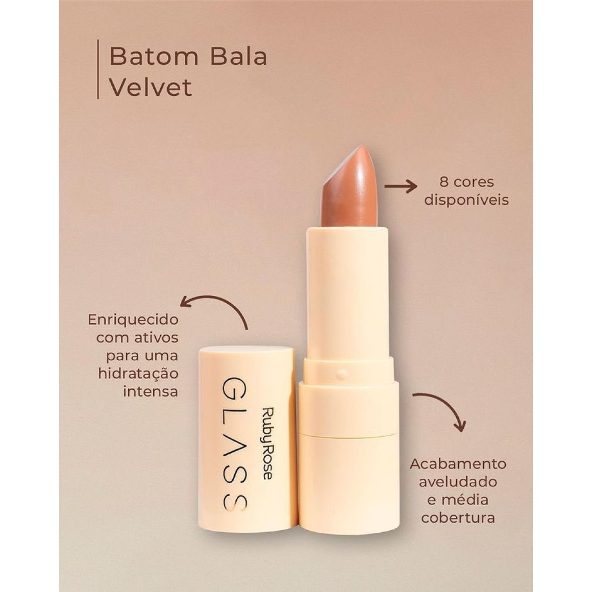 O Batom em Bala Velvet Glass está disponível em uma variedade de tons deslumbrantes, adequados para todas as ocasiões, desde looks casuais até produções mais elaboradas.