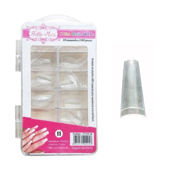Características Técnicas - Modelo: OY099-11 - Tips Bailarinha Transparente - Contém: Kit com 100 unhas postiças/10 tamanhos diferentes - Material: Plástico ABS de alta resistência e não trinca - Alonga e dá maior beleza e fino acabamento nas suas unhas - Os tamanhos são separados em compartimentos separados individuais para sua praticidade - Cola não inclusa