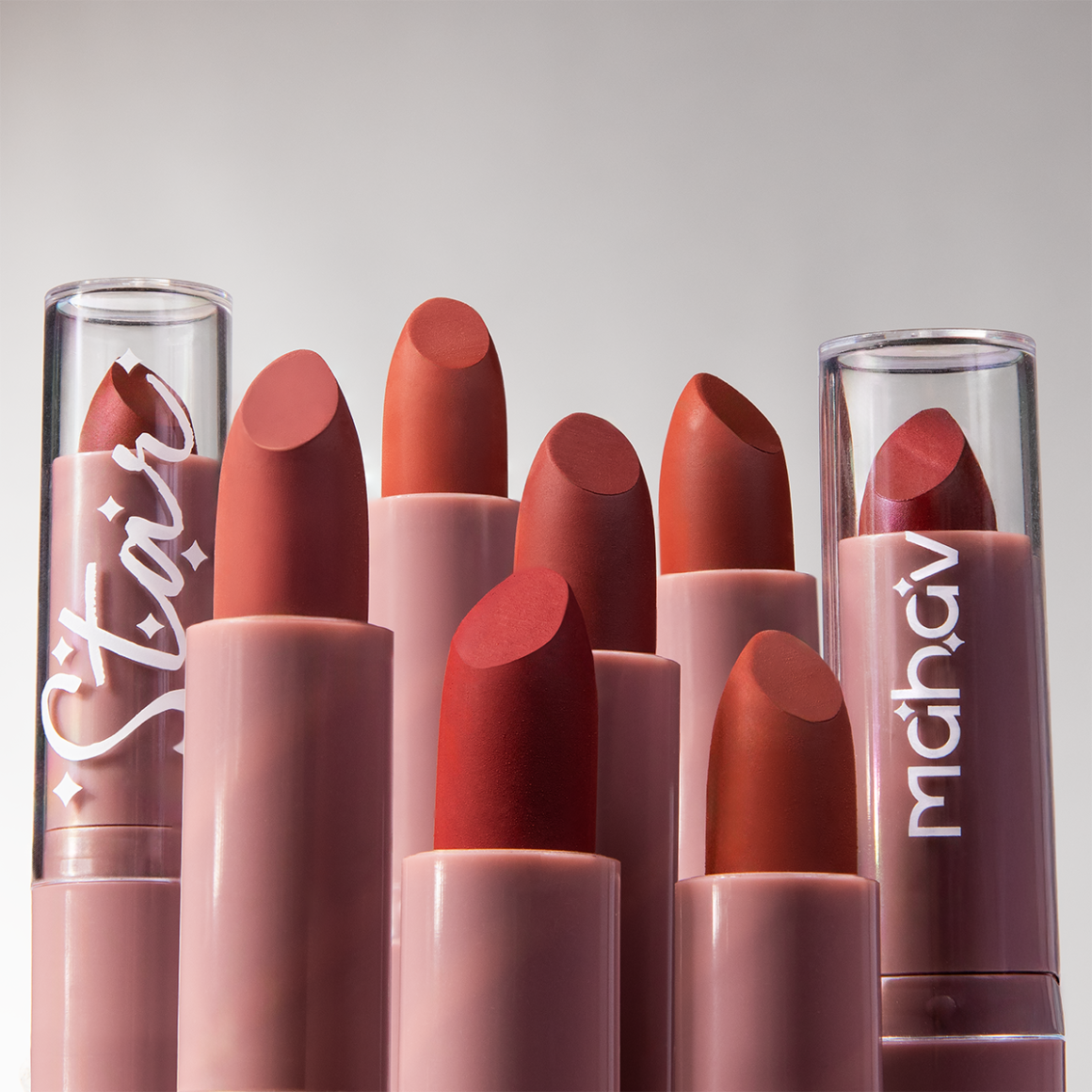 O Batom Bastão Star Mahav oferece textura cremosa e suave que desliza facilmente nos lábios, proporcionando aplicação uniforme e confortável. Com alta pigmentação já na primeira camada, forma uma película fina com cobertura intensa e sensorial confortável. Está disponível em acabamento SOFT MATTE e possui uma cartela com 6 cores clássicas e atemporais.
