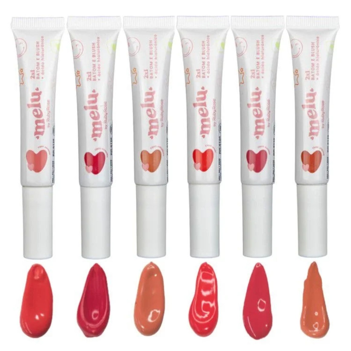 Chegou o melhor produto multifuncional que você vai se apaixonar! A bisnaga que te oferece pigmentação, hidratação, aplicação perfeita e com 12 cores modernas e divertidas! O 2x1 Batom e Blush da MELU! Contendo Ácido Hialurônico, que garante hidratação e suavidade aos seus lábios e rosto.