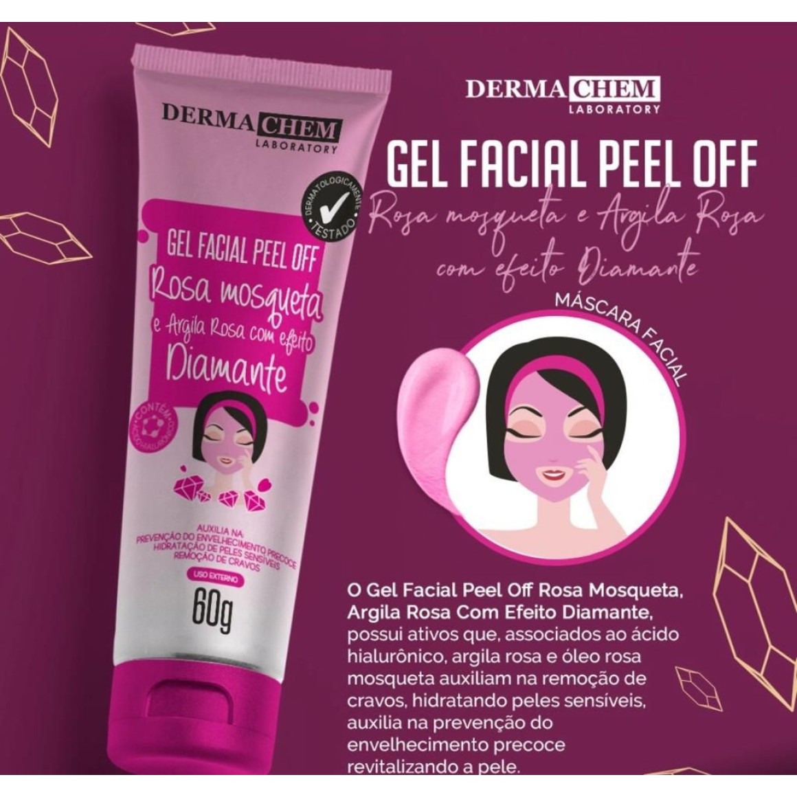 O Gel Facial Peel Off Rosa Mosqueta e Argila Rosa com Efeito Diamante da Dermachem Laboratory possui ativos que, associados ao ácido hialurônico, argila rosa e óleo de rosa mosqueta, auxiliam na remoção de cravos, hidratam peles sensíveis e ajudam na prevenção do envelhecimento precoce e na revitalização da pele.