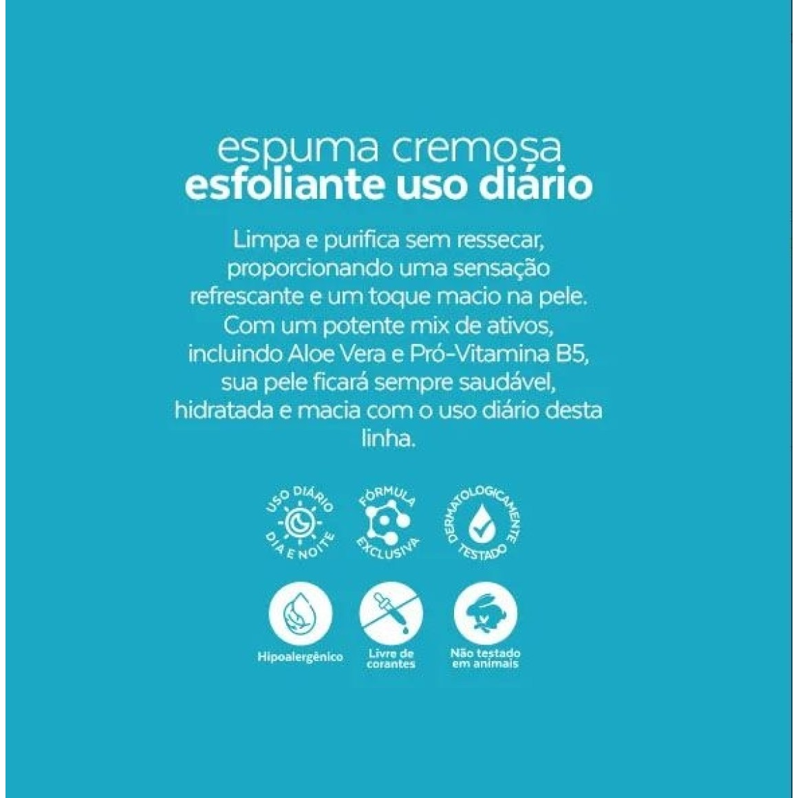 Revitalize sua pele com a Espuma Cremosa Esfoliante Uso Diário, que suaviza e a deixa macia. Com micropartículas de arroz, remove suavemente resíduos e células mortas, refinando a textura da pele. Enriquecida com Aloe Vera e Pró-Vitamina B5, sua fórmula hidrata e proporciona uma sensação contínua de suavidade.