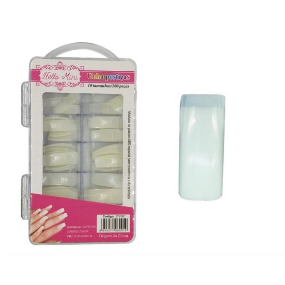 Características Técnicas - Modelo: OY001-6 - Tips Quadrada - Contém: Kit com 100 unhas postiças/10 tamanhos diferentes - Material: Plástico ABS de alta resistência e não trinca - Alonga e dá maior beleza e fino acabamento nas suas unhas - Os tamanhos são separados em compartimentos separados individuais para sua praticidade - Cola não inclusa